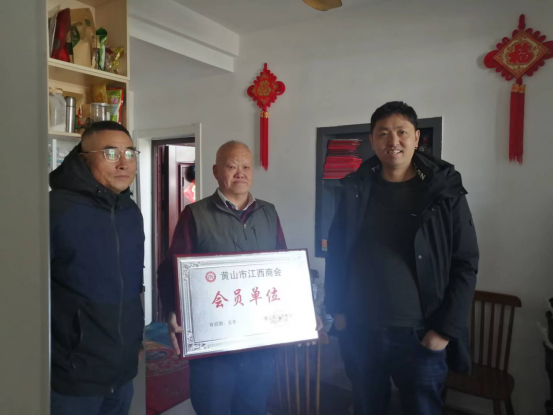 元旦节新年的第一天,黄山市江西商会轮值会长黄继文带领秘书处工作人员走访新会员。旨在进一步提升商会凝聚力和向心力,加强商会与会员之间的沟通联系,充分发挥商会桥梁作用,提升商会服务水平。先后走访了李宏臻总经理企业黄山市臻粥道海鲜砂锅粥、李建总经理黄山市智创机器人科技有限公司、占志辉总经理企业黄山飞翔厨盛酒店用品销售公司、邹涵总经理企业安徽省瑞硕医疗科技服务有限公司,新会员贾维亮,他是黄山供电公司退休职工,又是徽菜大师。轮值会长黄继文为五家新会员授“黄山市江西商会会员单位”牌。