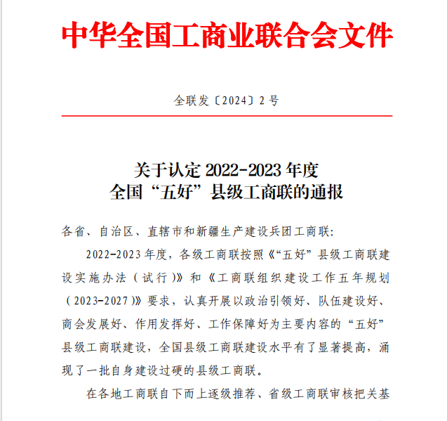 据了解,全国工商联每两年开展一次全国“五好”县级工商联评选工作,评定标准是指政治引领好、队伍建设好、商会发展好、作用发挥好、工作保障好。县级工商联认定工作由全国工商业联合会组织开展,在各地工商联自下而上逐级推荐、省级工商联审核把关基础上,最终由全国工商联组织复核审定。